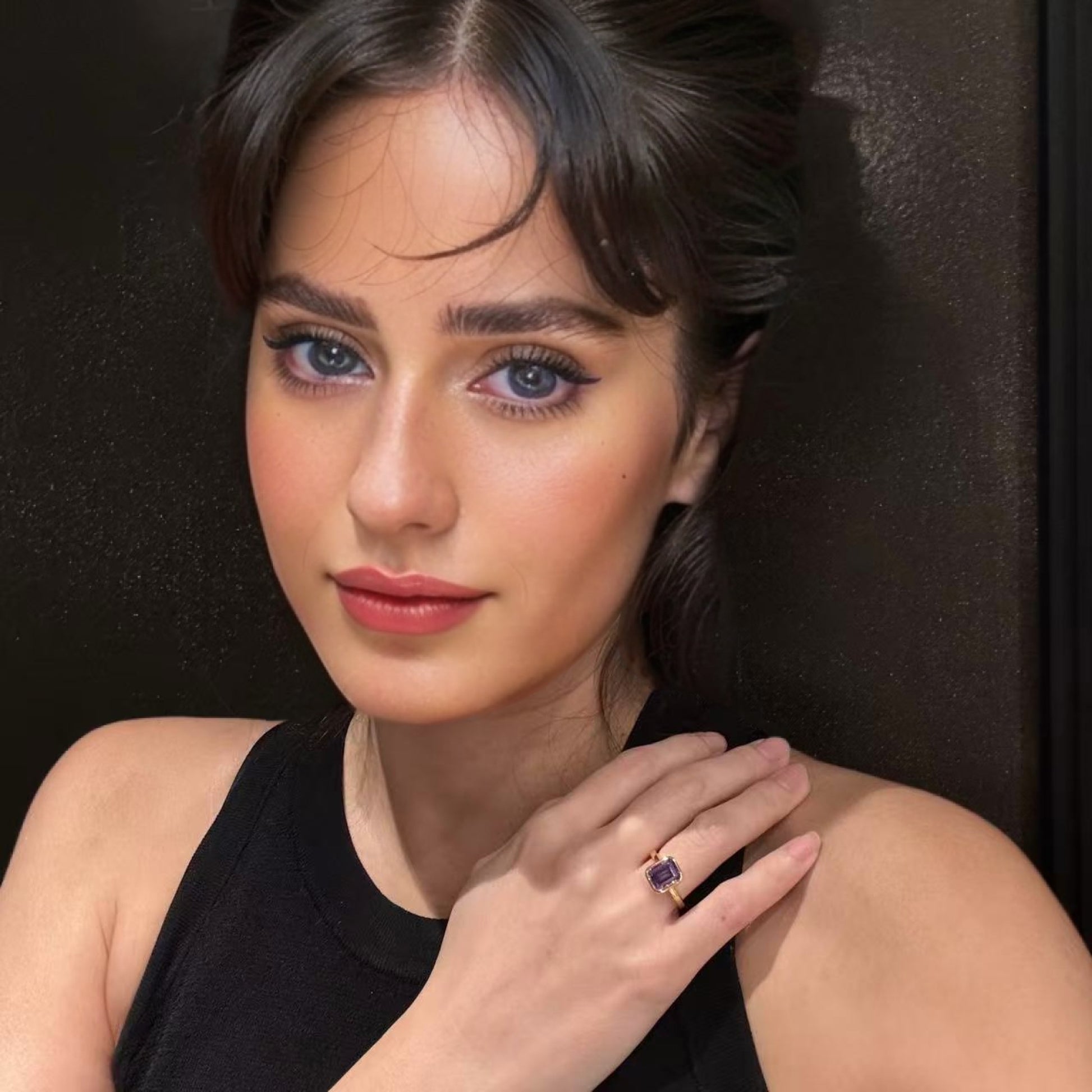 RIZILIA CELEBOX Solitaire Engagement Ring with Emerald Cut Gemstones CZ [6 Colors available] in Yellow Gold Plated, Celebrity inspired by Angelina Jolie