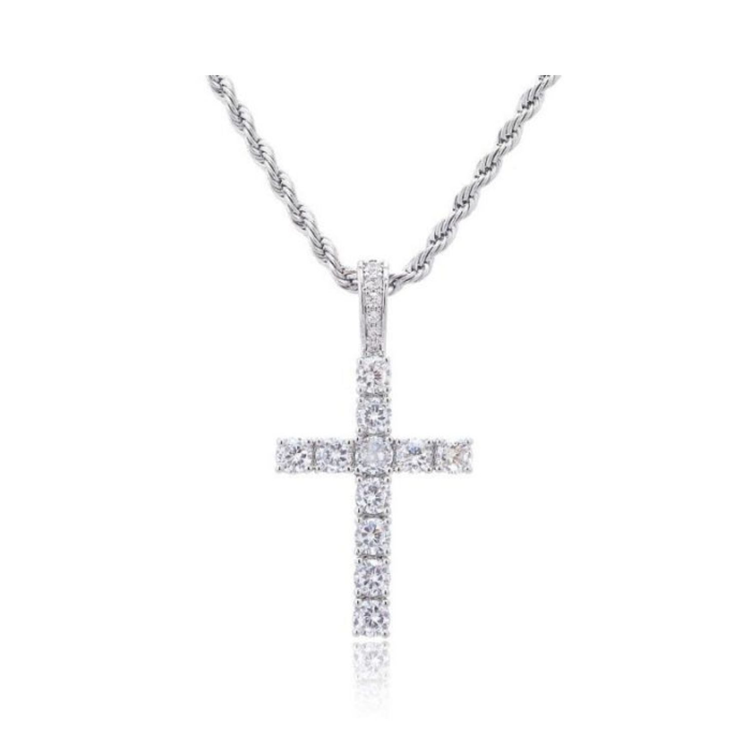 RIZILIA 18K White Gold Plated Women's Cross Necklace, Round Cut CZ [Simulated White Topaz] Cross Pendant Necklace for Women with 24" Long Rope Chain, Trendy Jewelry Gift for Women
