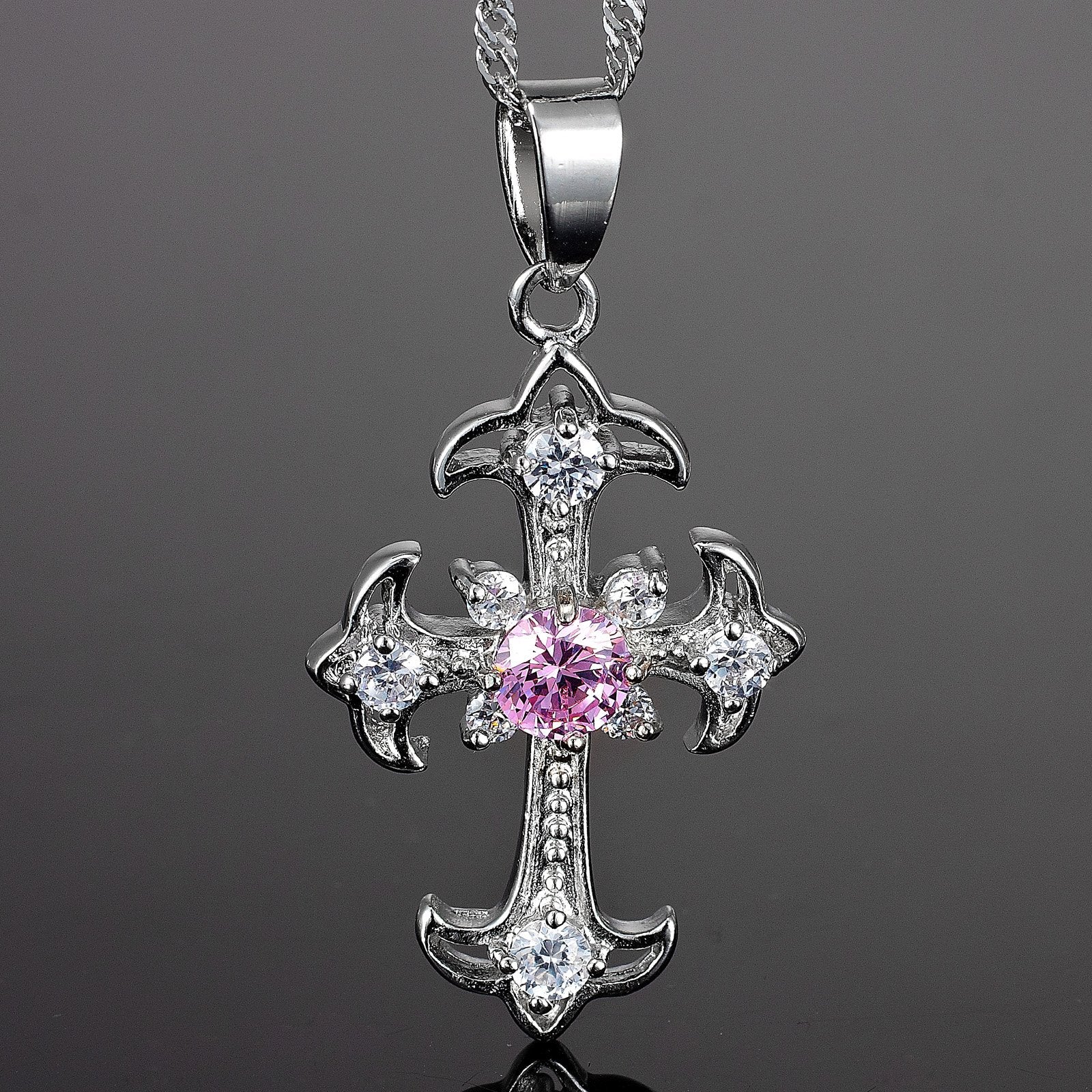 RIZILIA Cross Pendant with 18" Chain & Round Cut CZ [5 Colors available] in White Gold Plated, Simple Modern Elegant